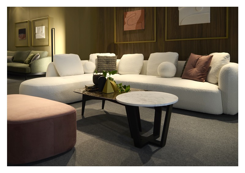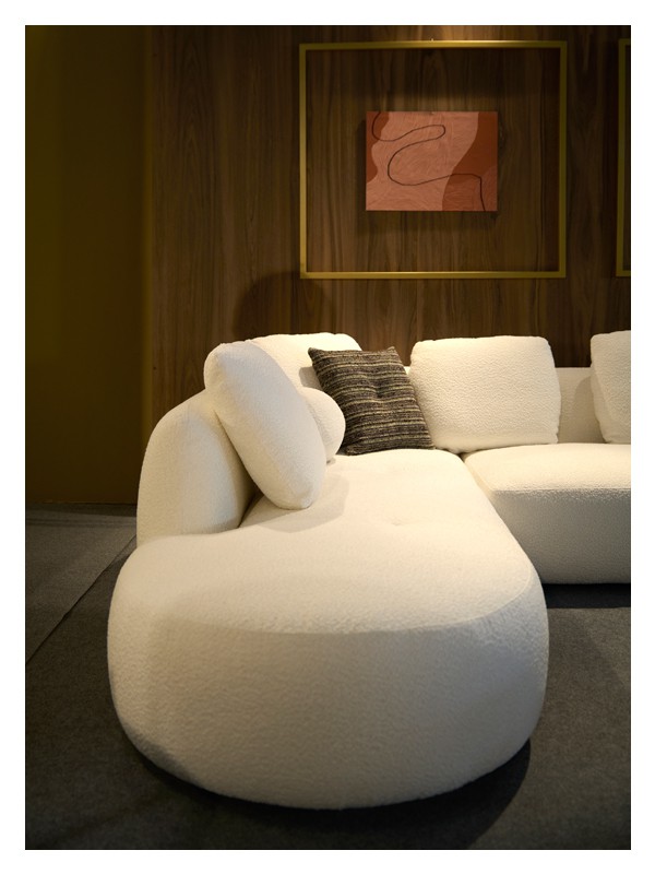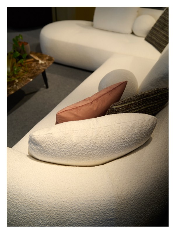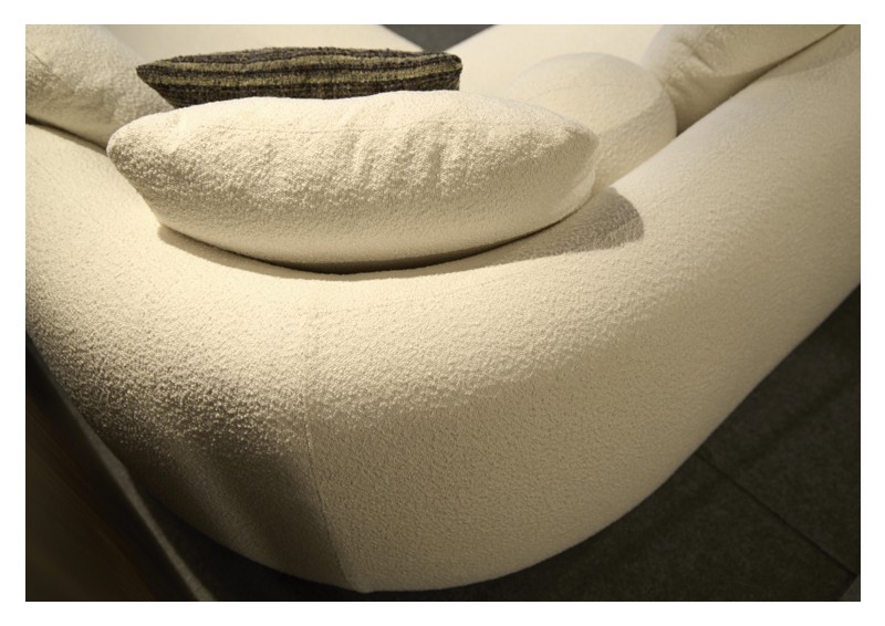 Καναπές γωνιακός με καμπύλες με σκελετό από μασίφ ξύλο. Το κάθισμα είναι σε φόρμα, από λάστιχα μεγάλης πυκνότητας με πλήρη επαναφορά, επενδεδυμένα με βάτα dacron 5cm. Τα μαξιλάρια της πλάτης και τα διακοσμητικά περιέχουν πούπουλο χήνας. Σε όλα τα μαξιλάρια τα ύφασματα είναι αφαιρούμενα. Δυνατότητα επιλογής του υφάσματος.